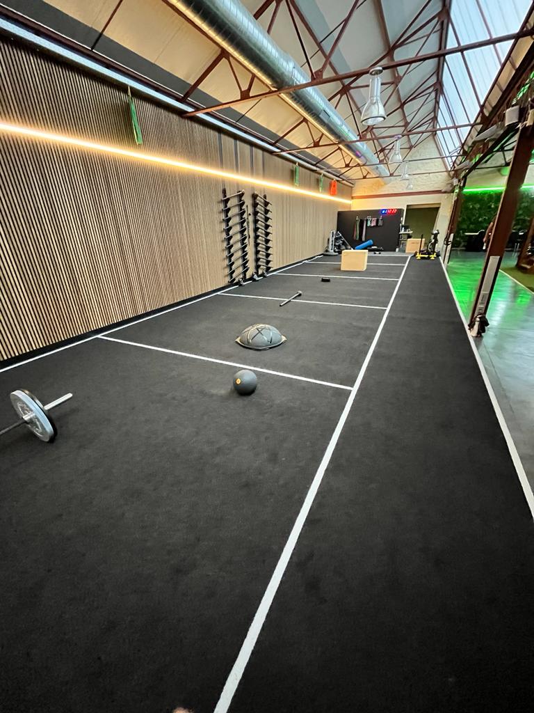 In de fysieke ruimte vind je een functionele muur, losse materialen en enkele self-powered toestellen. Voor een natuurlijk gevoel staat alles op kunstgras, waarop je zelfs met blote voeten kunt trainen. Geen klassieke fitnessruimte dus.